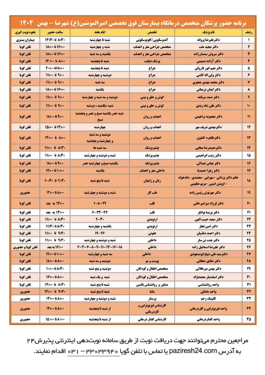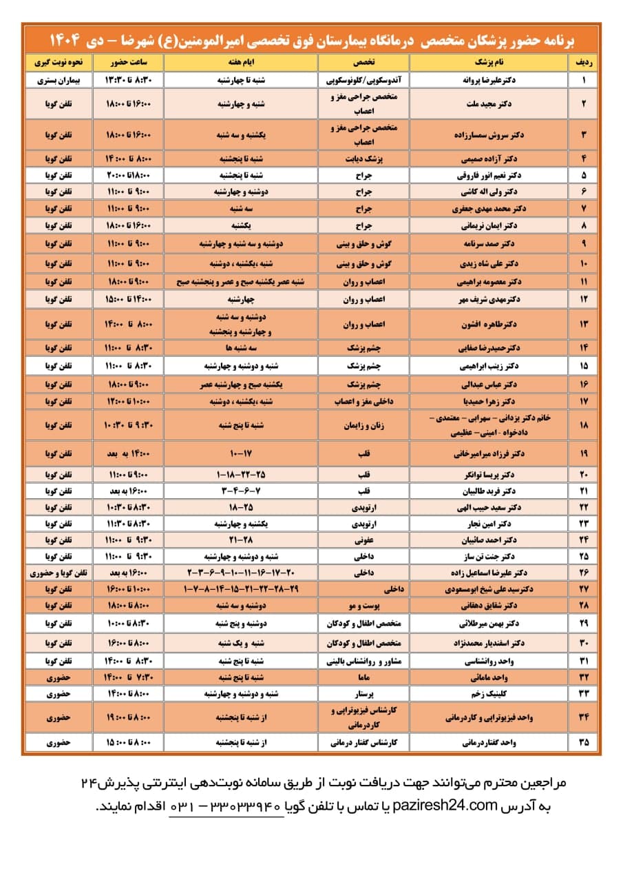 برنامه حضور پزشکان در درمانگاه تخصصی بیمارستان
